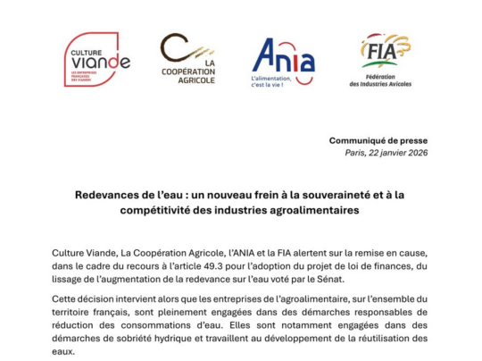 Culture Viande Les Entreprises Françaises des viandes, La Coopération Agricole, l’ANIA (Association Nationale des Industries Alimentaires) et la Fédération des industries avivoles alertent sur la remise en cause, dans le cadre du recours à l’article 49.3 pour l’adoption du projet de loi de finances, du lissage de l’augmentation de la redevance sur l’eau voté par le Sénat.