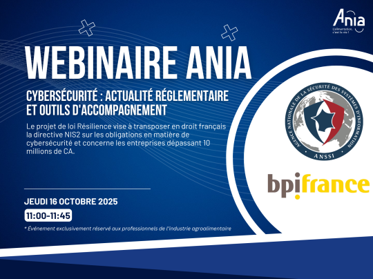 Un webinaire cybersécurité : actualité réglementaire et outils d’accompagnement est organisé par l’ANIA le 16 octobre 2025 à 11h00.